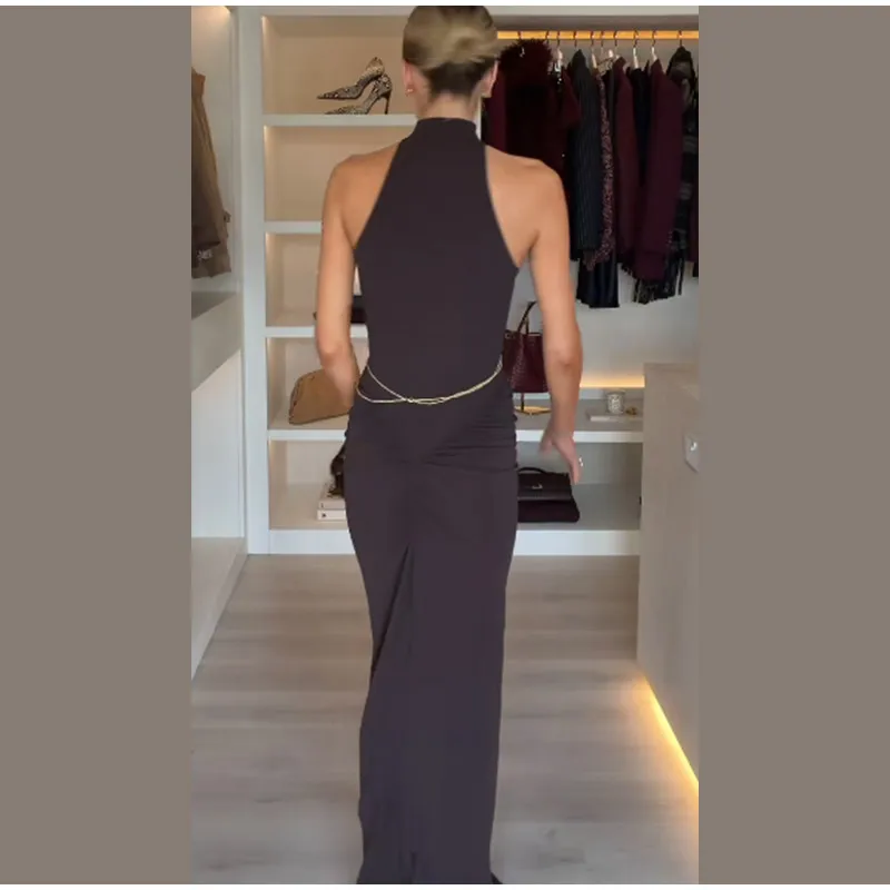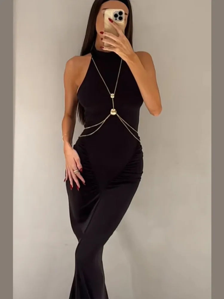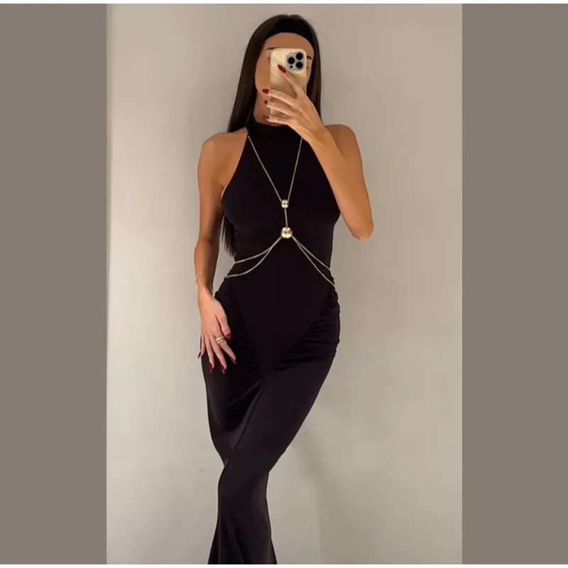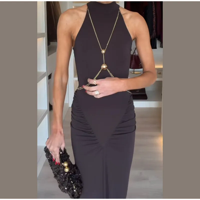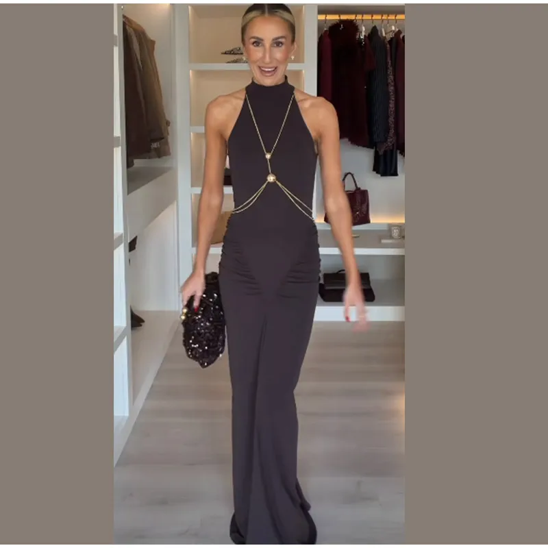 Elevate your evening look with the sophisticated metal chain detail, thoughtfully placed to create a striking visual contrast.