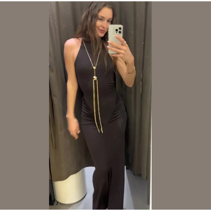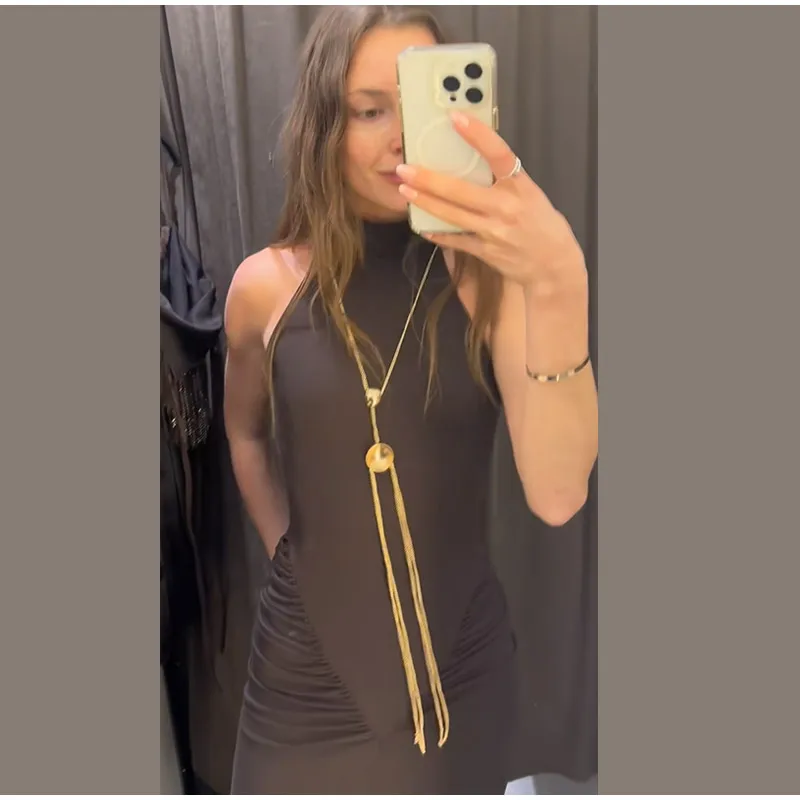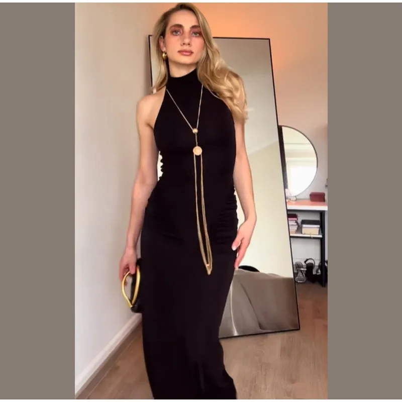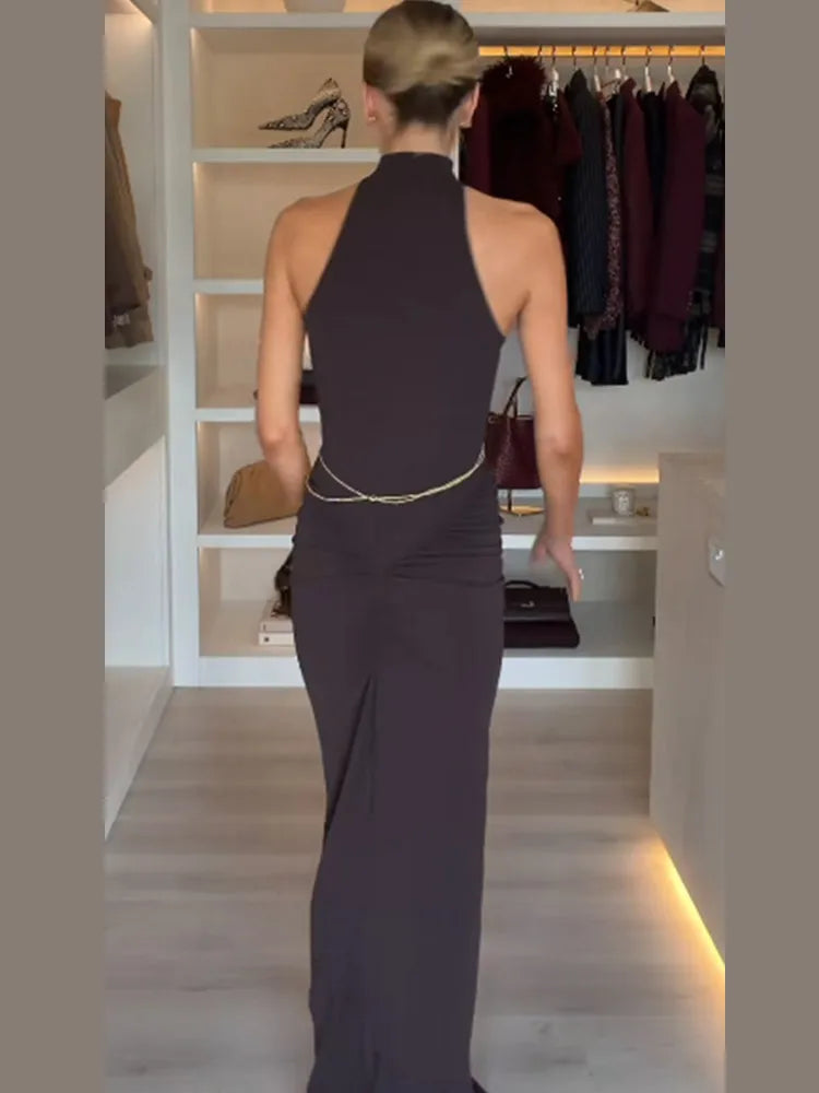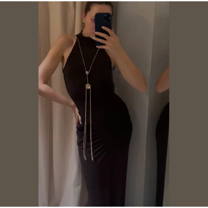 Elevate your evening look with the sophisticated metal chain detail, thoughtfully placed to create a striking visual contrast.